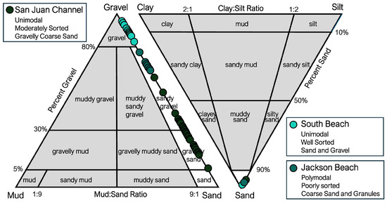 Sediment characteristics of sites in the San Juan Archipelago (SJA), including the protected beach (Jackson Beach, sandy gravel), exposed beach (South Beach, mostly gravel), and offshore subtidal site (San Juan Channel, sandy gravel and gravelly sand). Points indicate the mean particle size sediment attributes for the individual samples taken at each site and categorized using GRADISTAT software. All sites were devoid of silt and mud.