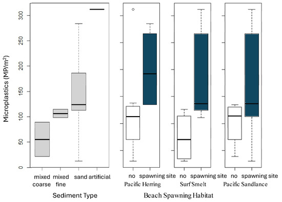 Boxplots of MP concentrations (microplastics/m2) in Puget Sound beach sites according to sediment type (mixed coarse, mixed fine, sand, artificial) and forage fish beach spawning habitat (dark blue = spawning habitat; white = not spawning habitat).