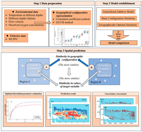 The geographical similarity method: (1) Since this study conducted annual averaging of environmental and fisheries data, the geographic similarity method consequently failed to account for the temporal variations in the marine environment and skipjack tuna resources. Subsequent research should build upon this and incorporate time-series effects to elucidate the spatiotemporal fluctuations in the responses of Pacific purse seine skipjack tuna to changes in dominant environmental factors. (2) For the setting of similarity thresholds in the geographic similarity method, further sensitivity analyses can be conducted in subsequent research to systematically evaluate the impact of different threshold settings on the model’s prediction results. Although the thresholds in the current study have, to a certain extent, embodied the similarity screening mechanism, their robustness has not yet undergone rigorous testing. (3) In the future, it is also worth exploring the integration of the geographic similarity method with traditional spatial models (such as Geographically Weighted Regression (GWR) and Kriging) to further enhance its explanatory power and inferential value. For instance, attempts can be made to construct a regression Kriging method based on geographic similarity weights, or to introduce the similarity matrix into the Geographically Weighted Regression (GWR) model to replace the traditional geographic distance kernel function. This would enable local modeling of environmental configuration similarity. Such hybrid methods are expected to take into account both geographic similarity structures and spatial dependence characteristics, providing more robust and flexible tools for spatial prediction of resource distribution and mechanism identification. (4) Regarding the characterization of uncertainties, this study primarily focused on the distribution differences in spatial prediction results and has not systematically encompassed uncertainties at the levels of model parameters and structural assumptions. Therefore, in the future, it is necessary to further expand the identification and quantification of uncertainties from different sources on the basis of the existing spatial prediction uncertainties.