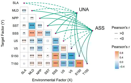 Correlation of environmental variables with catch of different fish schools. (UNA represents unassociated schools; ASS represents associated schools). (* represents 90% confidence interval).