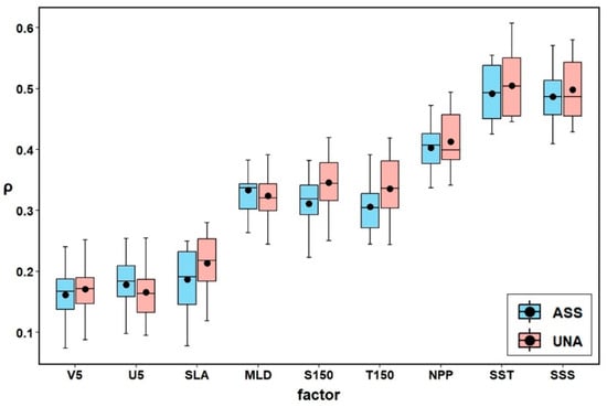 Figure 3 and Figure 6 further demonstrate that unassociated schools exhibit stronger responses to environmental factors than associated schools, indicating that unassociated schools rely more on natural environmental variations for habitat selection. In contrast, the deployment of FADs partially disrupts the environmental response capacity of associated schools. In terms of biological characteristics, differences in the type of purse seine used can lead to variations in the body length composition of catch [55]. Unassociated schools tend to have larger body lengths and higher ages, and they rely more on natural environmental changes to make habitat choices. In contrast, associated schools have smaller body lengths and lower ages, and they are less sensitive to environmental changes [55,56,57]. This difference means that the spatial distribution of associated schools is more likely to be driven by their schooling behavior, which weakens the direct impact of environmental factors on their distribution. Consequently, this affects the accuracy and stability of model predictions [58].