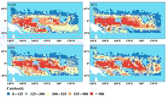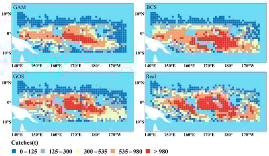 In Figure 5, GAM predicted that the high-catch areas of unassociated schools were mainly located in the western region (145° E–160° E, 10° S–2° N), with some high-catch areas also in the eastern region (175° E–180° W, near 0°). By contrast, the BCS model suggested a more focused distribution, primarily around the equator in the west (140° E–160° E) and in eastern waters (165° E–178° E, 7° S–2° N), covering a broader range than GAM. The GOS model’s predictions showed more concentrated high-catch areas in western waters (142° E–158° E) compared to BCS, while also capturing extensive eastern activity reaching close to 180°. By comparing with the actual catch of unassociated schools, it can be observed that there are certain discrepancies between the predicted results of GAM and the BCS model and the distribution of the actual catch. In contrast, the predicted results of the GOS model demonstrate higher accuracy and can better reflect the actual distribution of catch.