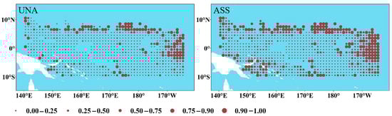 Overall, Figure 7 shows that some areas consistently exhibit high uncertainty values (0.75–1.00), with a portion of these high-uncertainty zones located in coastal waters. These coastal areas typically fall within the Exclusive Economic Zones (EEZs) of coastal states. Under WCPFC regulations, EEZs have specific management regimes and fisheries policies, where states hold sovereign rights over resource exploitation and utilization. Such institutional arrangements may lead to intensive human activities in these areas, particularly concentrated fishing efforts, resulting in disturbances to local ecosystems. WCPFC data also indicate [59] that these high-uncertainty zones show significant spatial overlap with areas of high fishing effort. In addition, within these regions, the proportion of fishing using FADs is relatively high. Such intensive deployment of FADs may lead to abnormal fluctuations in environmental variables, reducing environmental stability. Consequently, this undermines the performance of prediction models based on geographic similarity, manifesting as an increase in uncertainty [60,61,62].