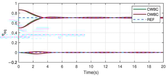 In most cases, the main vehicle is preferably kept horizontal because of the requirements of the attached sensors (e.g., Doppler velocity logger (DVL), camera). By defining and the corresponding Jacobian , a horizontal attitude holding task is considered.