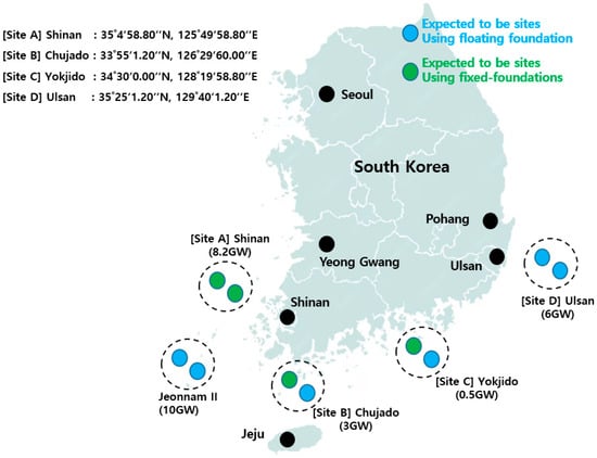 In South Korea, starting with the construction of a 30 MW fixed offshore wind farm northwest of Jeju, the construction of a 60 MW southwest sea offshore wind demonstration complex was completed. As shown in Figure 1, multi-GW-scale offshore wind farm development plans are currently being promoted and are centered on the southwest, south, and east coasts.