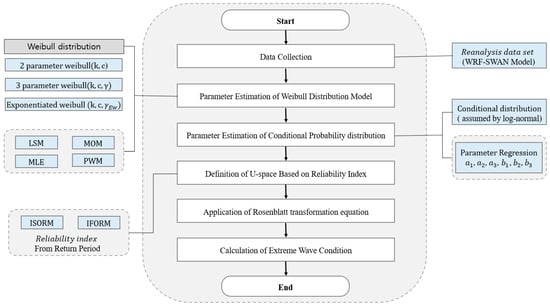 The process of estimating extreme wave conditions based on the joint distribution of significant wave height and peak period is illustrated in Figure 2. The procedure begins with the collection of long-term reanalysis data, followed by modeling the marginal distribution of significant wave height using various Weibull distributions. Parameters are estimated using several statistical techniques, including LSM, MLE, MOM, and probability weighted moment (PWM).