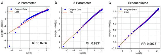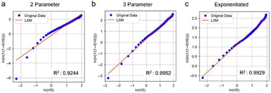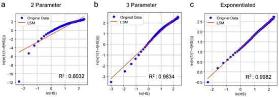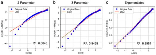 The LSM, MLE, MOM, and PWM were applied to estimate the Weibull distribution parameters. Figure 3, Figure 4, Figure 5 and Figure 6 present the LSM fitting results for two-parameter, three-parameter, and exponentiated Weibull distribution models for the Shinan, Chujado, Yokjido, and Ulsan sea areas.