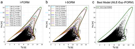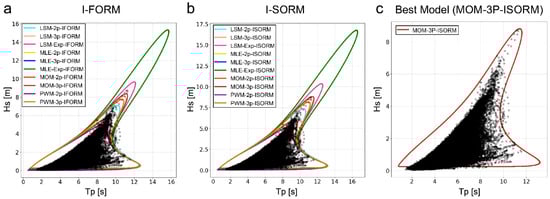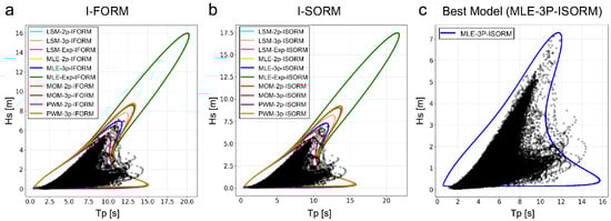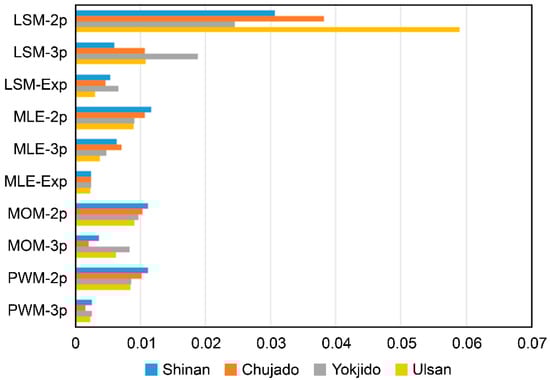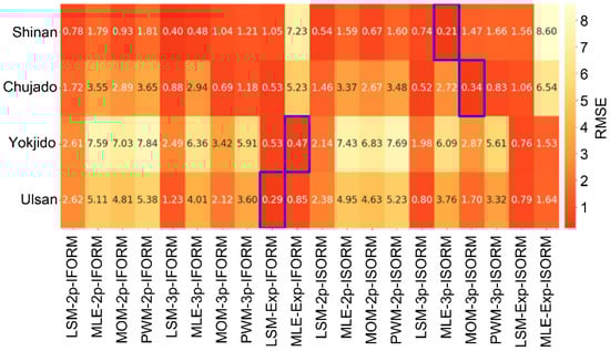 In the Shinan sea area, the MLE-3P combination using I-SORM showed the best performance, with an RMSE of 0.21. For the Chujado area, the combination of I-SORM and MOM-3P provided optimal results with an RMSE of 0.34. In contrast, the I-FORM approach was more effective for the Yokjido and Ulsan sea areas, where the MLE-Exp and LSM-Exp combinations provided the lowest RMSE values of 0.47 and 0.29, respectively.