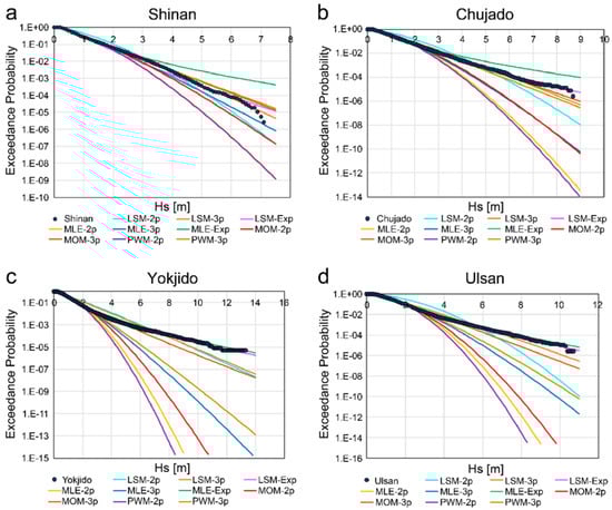 Figure 8 shows the results of converting the exceedance probability to a logarithmic scale to evaluate the tail region fitness of the Weibull distributions. The analysis reveals that the quality of fit in the tail region varies significantly across the four sea areas. In the Shinan area, the combination of LSM-3P and MLE-3P yielded superior fits, whereas in the Chujado area, MOM-3P and LSM-Exp performed the best. The MLE-Exp and LSM-Exp combinations exhibited the highest tail region fit for the Yokjido and Ulsan regions.