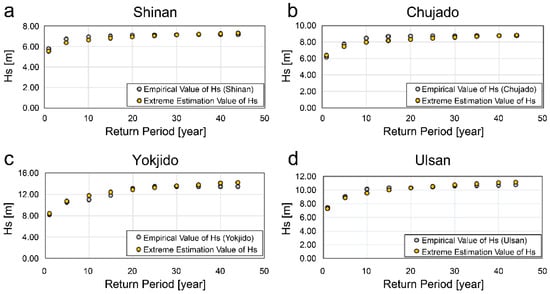 Figure 10 shows a comparison of the marginal empirical return value by return period and the extreme values estimated by optimal statistical techniques for each sea area. Figure 11, Figure 12, Figure 13 and Figure 14 present EC with a 44-year return period, the same as those of the sample data collection period, for each sea area.
