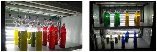 Nephroselmis sp. was isolated from lagoons in Western Greece, and identified based on morphological observations and DNA sequencing data [27]. Nephroselmis was cultured in batch mode in 1.5 L sterilized plastic bottles containing enriched seawater using Walne medium [28], with a salinity of 40 ppt, under controlled room conditions at 22 °C (Figure 1). The cultures were permanently mixed by bubbling ordinary air (approximately 0.04% CO2), prefiltered through a 0.45 µm filter, at a flow rate of 0.5 L/min. The cultures were exposed to different light intensities of 3000, 8000 and 15,000 lux and various light colors, including white, red, green, blue and yellow, by covering the bottles with colored paper (Figure 1). White light was used as the control.