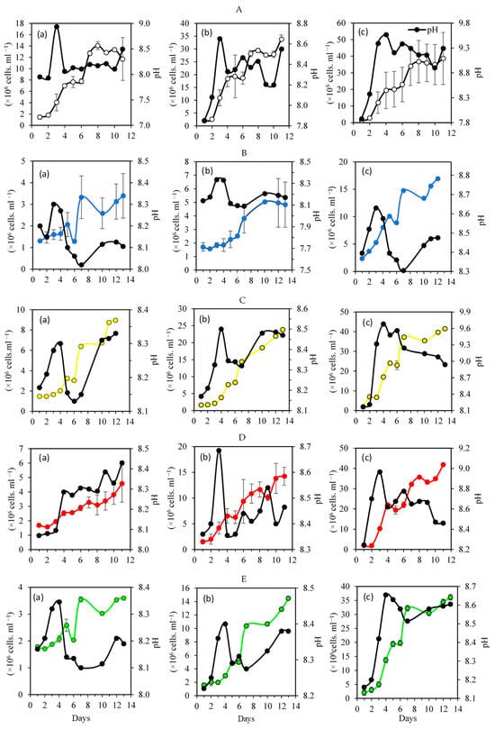 Kinetic growth of Nephroselmis sp. reared under different combined color and intensity values: (A) white light; (B) blue light; (C) yellow light; (D) red light; (E) green light. (a) 3000 lux, (b) 8000 lux, (c) 15,000 lux. The black line with solid black points in each subfigure corresponds to the pH, while the colored lines correspond to the number of cells.