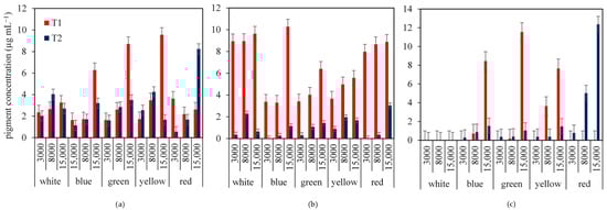 Effects of combined light intensities (3000, 8000, and 15,000 lux) and colors (white, blue, green, yellow and red) on pigments biosynthesis in Nephroselmis sp. at the lag (T1) and the stationary (T2) phases of culture: (a) chlorophyll-a, (b) chlorophyll-b, (c) carotenoids.