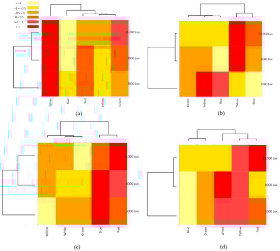Heatmaps of the combined effect of colors (white, blue, red, yellow and green) and high-intensity light (3000, 8000 and 15,000 lux) on the protein (a), carbohydrate (b), lipids (c) and polyphenols (d) biosynthesized by Nephroselmis sp. The color scale represents concentration levels from yellow (low) to red (high).