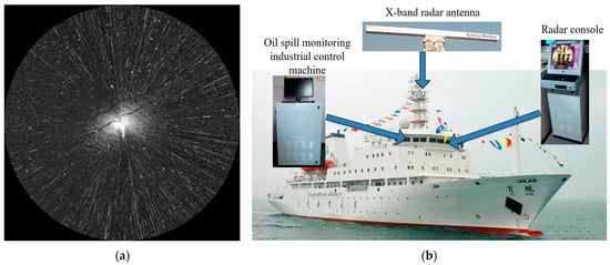 The experiment employed a series of shipboard radar images that were continuously collected during specialized oil spill monitoring cruises. The data used in this study were collected from a real incident near a coastal terminal in Dalian Bay caused by a pipeline failure during tanker unloading. All data were obtained by the training vessel Yukun of Dalian Maritime University during routine patrol missions, specifically at the site of the major oil spill accident that occurred in Dalian on 16 July. Figure 1 presents the radar platform and a sample image. The shipborne radar system operates in the X-band and adopts the horizontal polarization mode, with a detection range of 0.75 nautical miles (NM). Radar data are collected through continuous image acquisition with a period of 2 s, and dynamic sea surface scenes are recorded in a size of 1024 × 1024 pixels. The shipborne navigation radar is adopted as the core data acquisition device for the real-time marine monitoring of oil spills.