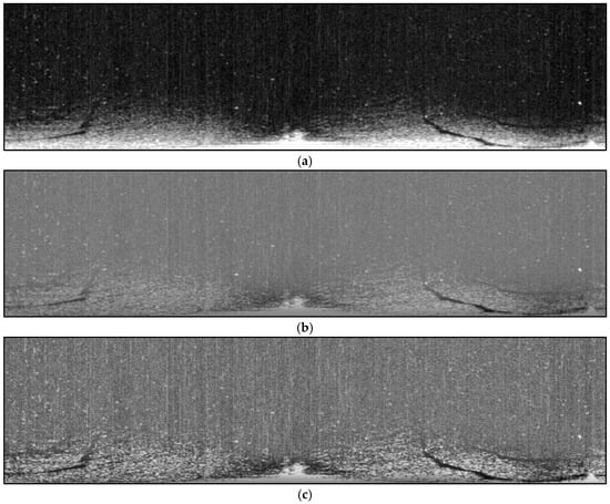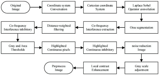 The data preprocessing flowchart is shown in Figure 2. Initially, the raw image is transformed from polar coordinates to the Cartesian coordinate system. Subsequently, the Laplacian operator convolution and Otsu thresholding were applied to segment the co-frequency interference noise. The co-frequency interference noise was further processed by using a distance-weighted filtering method. Secondly, the gray threshold and isolated target area threshold were used to extract speckle noises in the image, as shown in Figure 3a. Then, the gray level co-occurrence matrix was generated to adjust the overall gray distribution of the noise reduction image, as shown in Figure 3b. Finally, the local contrast enhancement model was used to enhance the contrast inside and outside the oil films, as shown in Figure 3c.