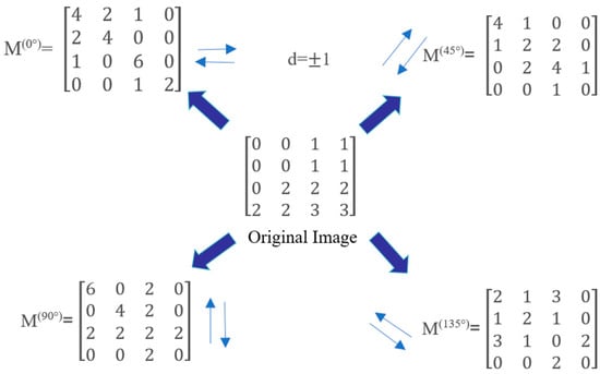 The GLCM is employed as a feature extraction technique that leverages both grayscale and gradient information in an image. The GLCM represents the probability that a pixel with grayscale intensity i co-occurs with another pixel in a specific spatial relationship. This relationship was defined by a given distance d and direction (0°, 45°, 90°, or 135°) [17,30]. As a result, the computation of the GLCM can be understood through the angles shown in Figure 4.