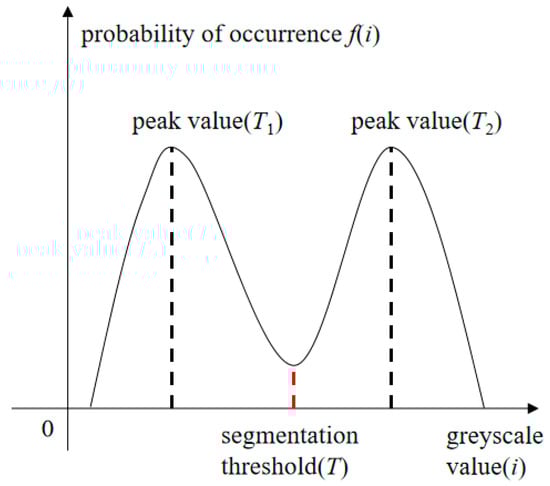 The bimodal histogram method is an adaptive thresholding technique. This method involves the iterative smoothing of the image grayscale histogram. Once two local maxima appear in the histogram, indicating a typical bimodal distribution, the valley point between the peaks is selected as the segmentation threshold, as shown in Figure 5. Here, T1 and T2 represent the local peaks, and T denotes the valley threshold between them.