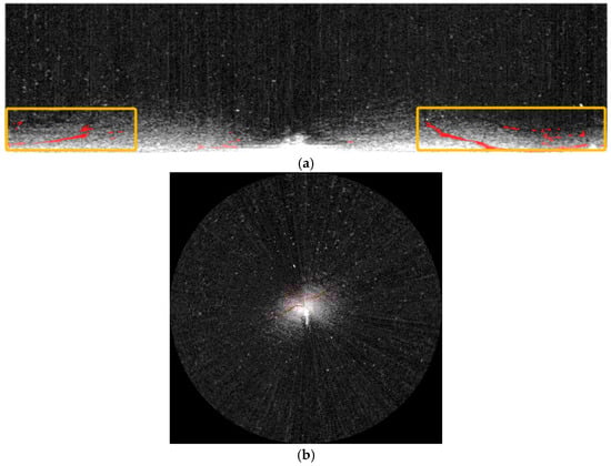 Firstly, small areas of noise in the segmentation of the ABC algorithm (Figure 10) with less than 50 pixels were removed. In addition, spatial constraints were applied through a mask image to eliminate located ship wake interference signals. Thereafter, the binary image was inverted to unify the representation of the target region, producing the final segmentation mask, as shown in Figure 11a. Next, a nonlinear coordinate transformation from Cartesian to polar coordinates was performed using bilinear interpolation. Polar parameters were computed by constructing an extended grid, and the segmentation result was mapped to the polar coordinate system along with the original radar image. After completing the geometric transformation, horizontal and vertical flipping were applied to the image matrix to adjust the orientation. The resulting polar coordinate image is shown in Figure 11b.