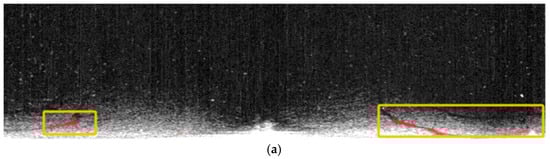 Currently, shipborne radar images in the field of oil spill detection still face several limitations. The shipborne radar system detects sea surface targets through the emission of electromagnetic waves and the reception of echo signals reflected by targets. Among these factors, wave fluctuations are identified as one of the key factors affecting the accuracy of radar recognition. Shipborne radar primarily relies on differences in sea surface roughness for the identification of oil films. When an oil spill occurs on the sea surface, the attenuation effect exerted by the oil film on centimeter waves leads to a reduction in the backscatter intensity of the radar. Consequently, weaker signal characteristics are observed in the oil film area of the radar image compared to the surrounding sea areas. Under adverse sea conditions, subtle differences in surface roughness can be masked by wave fluctuations, resulting in misjudgments of natural smooth areas or missed detections of actual oil spills. As illustrated in Figure 15a, accurate identification of the oil film area becomes particularly challenging in radar images characterized by large wave fluctuations. Additionally, high-level speckle noise can be introduced by strong wave fluctuations, further complicating the precise positioning of oil spill boundaries.