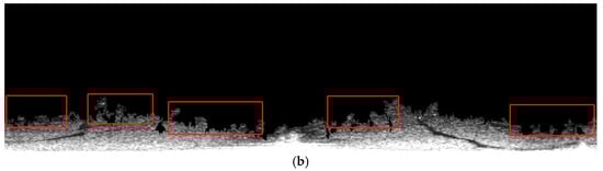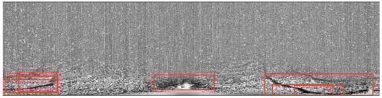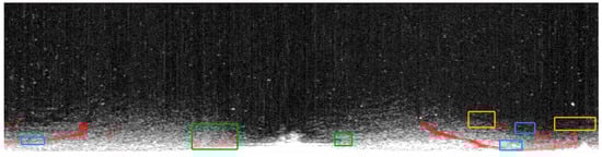 At present, relatively rich processing methods for radar images have been developed, among which image recognition technology based on deep neural networks has emerged as an important research direction. In this experiment, the YOLO object detection model was selected as the comparison benchmark. In terms of identifying oil film regions, target segmentation tasks can be accurately completed by the YOLO model, indicating its adaptability to radar image scenes. Then, as shown in Figure 14, a significant number of duplicate bounding boxes were generated by the YOLO model while predicting the oil films. The processing burden on subsequent recognition results is increased by these repetitions. In contrast, the occurrence of duplicates can be effectively reduced by the method used in our experiment, while maintaining high precision in oil film segmentation. Therefore, from a comprehensive performance perspective, the processing strategy proposed in our experiment possesses certain advantages over radar image oil film detection.