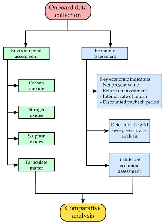 The case study vessel was built in 1998 and typically operates between ports in the southern United States, primarily Miami, and various destinations throughout the Caribbean Sea. This operational profile is particularly relevant, as Miami lies within the North American Emission Control Area (ECA) designated by IMO. ECAs enforce stricter SOX emission limits than the global standard, reducing the permissible sulphur content in marine fuels from 0.5% to 0.1%. The data for the environmental and economic assessments were collected from the ship’s electronic logbook, during the month of April 2024. Although the vessel is aging, company officials intend to keep it in operation for an additional ten years. This projected service lifetime has therefore been adopted as the time horizon for the economic modelling.