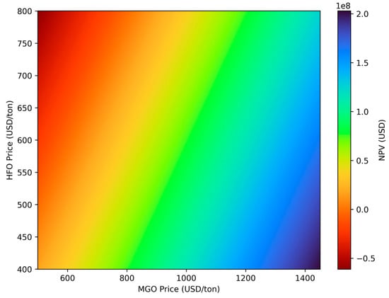 To address this, the present study conducted a deterministic grid sweep sensitivity analysis, which involved systematically evaluating combinations of HFO and MDO prices within the historical ranges shown in Table 7 [46]. This analysis aimed to assess the economic viability of scrubber installation under different fuel price scenarios by calculating the Net Present Value (NPV) for each price pair. For the scrubber installation to be considered economically viable, the NPV must remain positive. Otherwise, from both economic and environmental perspectives, switching to cleaner MDO fuel is preferred. This method allows for a robust understanding of how fluctuations in fuel prices impact investment decisions over the scrubber’s expected lifetime.