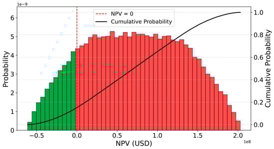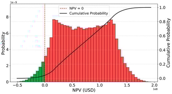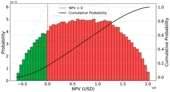 For each iteration, the correlated pair of HFO and MDO prices was used to compute the annual fuel cost differential between the two compliance options. This differential, adjusted for the fixed annual OPEX and amortized CAPEX of the scrubber system, was treated as a constant net cash flow over the vessel’s remaining 10-year operational life. The resulting cash flows were discounted at a rate of 10% and integrated into the Net Present Value (NPV) model, as defined in Equation (8). This probabilistic framework provides a robust basis for investment appraisal by incorporating both fuel price volatility and the statistical dependence between HFO and MDO prices under varying regulatory and market conditions [48,49].
