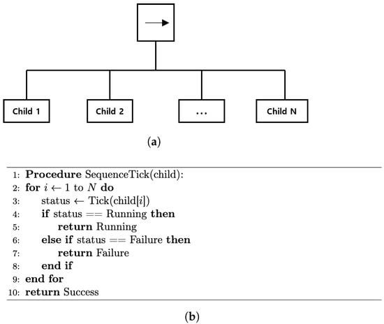 Sequence node. (a) Graphical representation with children ticked left → right. (b) Pseudocode that returns Failure or Running immediately and Success only when all children succeed.
