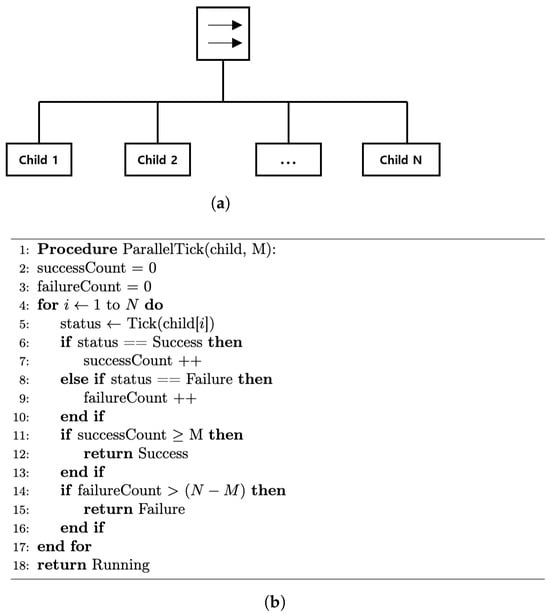 Figure 3a illustrates a parallel node that ticks all children each cycle, counting Successes and Failures. It returns Success when at least M children succeed, Failure when more than fail, and otherwise reports Running, as formalized in Figure 3b.