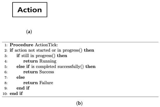 Action node. (a) Symbol used in the behavior tree. (b) Pseudocode that returns Running until the action completes, then Success or Failure.