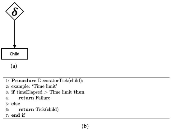 Finally, the decorator node in Figure 6a wraps a single child and alters—or simply filters—its result according to a custom rule such as timeout, inversion, or repetition. The example pseudocode in Figure 6b enforces a time limit.