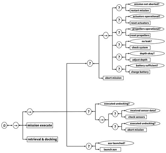 The primary objective of the launch phase is to ensure that the AUV safely undocks from the mothership and completes all essential pre-mission checks before commencing the primary mission. Figure 9 depicts the corresponding prepare-and-launch subtree, highlighting the sequence and fallback nodes that enforce these checks. The tree is organized around a top-level sequence node that triggers the critical tasks in order: issuing the launch command, verifying thruster and propeller operation, performing leak detection, checking depth limits, and confirming battery charge. Each test must return Success for the sequence to advance; if any anomaly (e.g., a faulty actuator, excessive depth, or low battery) is detected, execution is halted and routed to a diagnostic routine. Condition nodes also monitor whether the AUV has fully disengaged from the docking interface and whether sensor data streams are nominal. If undocking fails or a sensor fault is detected, a fallback branch issues a retry or, if necessary, aborts the launch. Only after all checks succeed and the AUV is clear of the mothership does control pass to the mission execution phase.