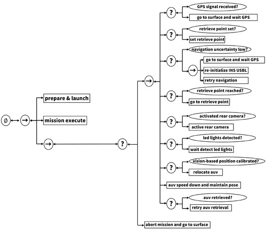 The retrieval phase focuses on safely recovering the AUV to the mothership after the mission is completed, with an emphasis on accurate localization and robust communication. Because both the mothership and the AUV remain submerged during this process, satellite-based GPS is generally unavailable, and the system primarily relies on ultrashort baseline (USBL) acoustic positioning for navigation, which provides an accuracy of approximately 1–3 m under typical operating conditions. The detailed retrieval and docking subtree, including these checks and contingency branches, is illustrated in Figure 11. The condition node continuously monitors the reliability and accuracy of USBL-based localization. Suppose the position uncertainty exceeds acceptable thresholds or acoustic communication becomes unstable. In that case, the fallback node immediately invokes contingency actions such as system reset (prepare system) or emergency ascent (abort and surface), temporarily surfacing the AUV to reacquire GPS-based position data if necessary. Navigation uncertainty is further monitored in real-time, and should localization confidence degrade, the AUV ascends to the surface to obtain a GPS fix before returning to the retrieval zone. Once reliable position information is restored, the AUV attempts to reach the designated retrieval point by executing the go-to retrieval point action, which is repeated until the AUV is confirmed to be within the required distance and bearing from the moving mothership.