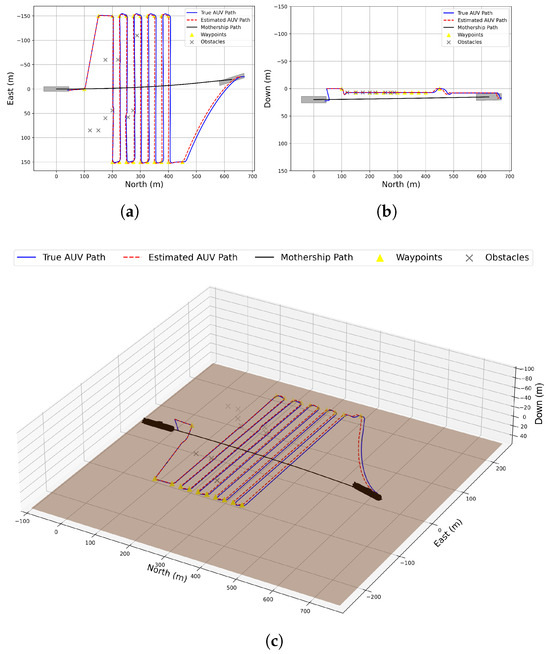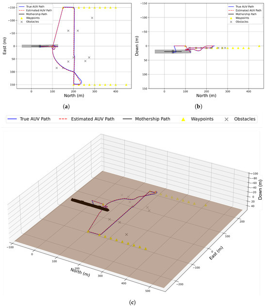 Result of nominal mission. (a) XY view. (b) XZ view. (c) Three-dimensional trajectory of AUV and mothership.