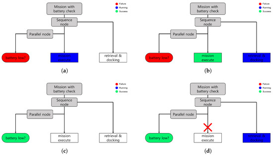 Behavior tree response to battery events. (a) Nominal running with battery above 30%. (b) Normal mission completion. (c) Low-battery trigger: Battery low? returns Success. (d) Retrieval subtree running after handover.