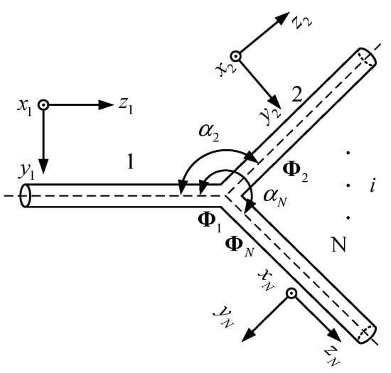 The model of the branch pipeline connected by N pipelines is shown in Figure 2. We define the angles between the first pipeline and the other pipelines as α1, α2, …, αN, while the state vectors of each pipeline at the branch points are Φ1, Φ2, …, ΦN. The main transmission path is from Pipeline 1 to Pipeline 2, and the remaining pipelines are regarded as branches.