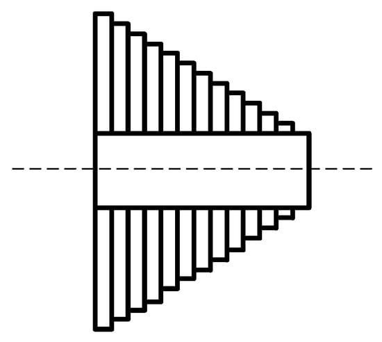 Method 1: Simplify the flange plate as a lumped mass. The point transfer matrix of the lumped mass is shown in Equation (6). However, the shape of the flange neck is irregular and cannot be directly solved using the existing mathematical model. Using the idea of finite elements, the flange neck is divided into n sections of length (as shown in Figure 6), and the length of each section is Δz = L/n. When Δz approaches 0, the flange neck of the weld-neck flange can be calculated approximately by the superposition of multiple sections of straight pipes with gradually changing cross-sections. Therefore, the transfer matrix of the flange neck can be expressed as follows: