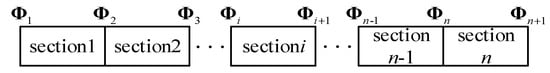 For the pipeline system with n elements shown in Figure 7, the transfer matrix Ui of each element can be established through the above theory, and the start-end state vector relation Φi = UiΦi+1 of the current element i can be deduced. Based on the continuity of the state vectors between components and combined with the boundary conditions at the initial and end of the pipeline system, the expression of the state vector transfer matrix of the system can be established as in the following Equation (12):