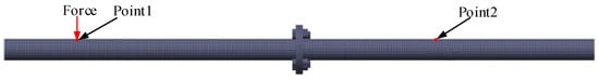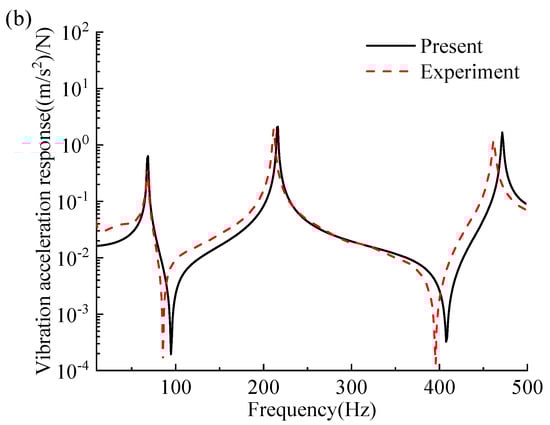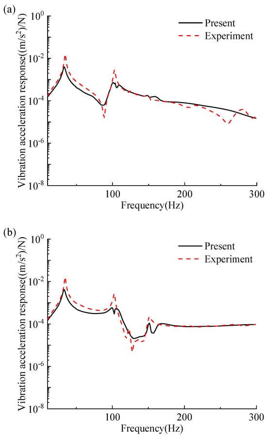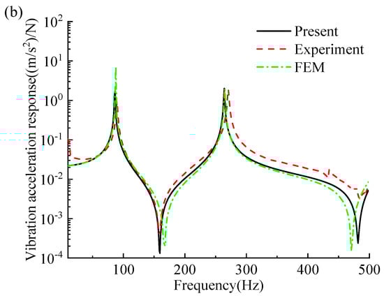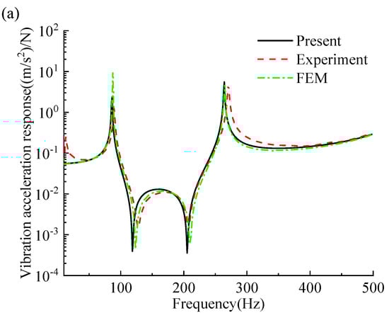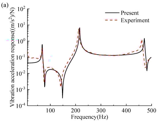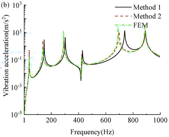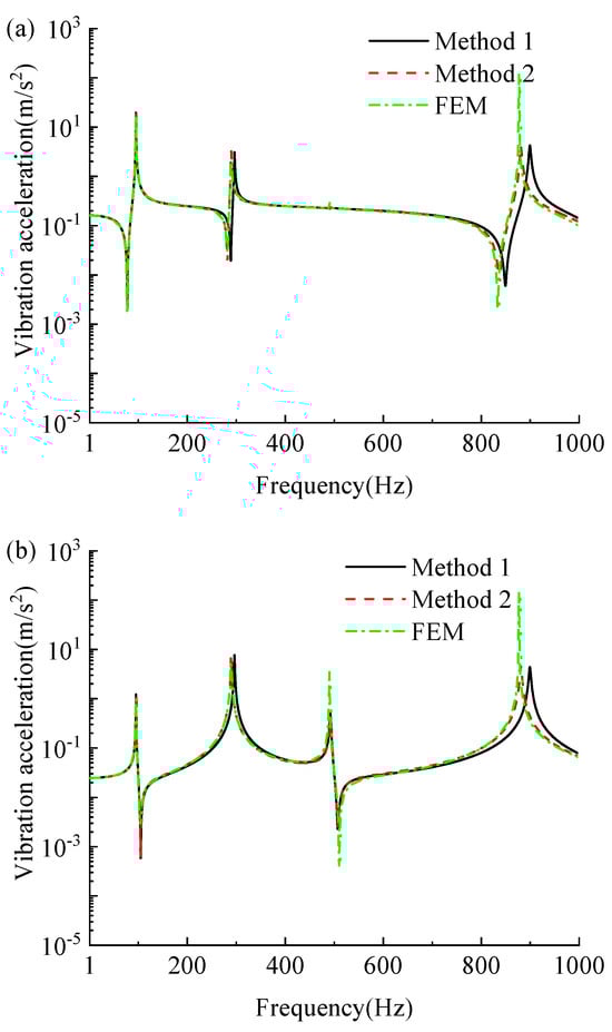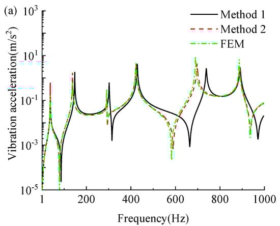 An external unit harmonic excitation force is applied at 0.2 m from the beginning of the pipe. Measurement point 1 is located at the excitation application point, and measurement point 2 is 0.5 m from the end. The acceleration responses of the pipe are solved using the two methods proposed in this paper and FEM. The comparison results are shown in Figure 11, and the corresponding first four natural frequencies are presented in Table 2. Due to the small mass and irregular shape of the flange connection bolts and nuts, subsequent calculations only consider their mass’s influence on the pipe’s vibration response, ignoring the moment of inertia.