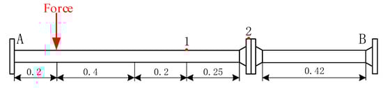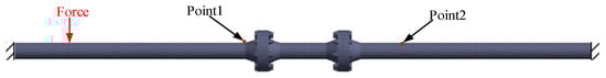 The pipe model is depicted in Figure 9. The length, inner radius, and wall thickness of the pipe are L = 2 m, R = 0.0325 m, and e = 0.005 m. Both ends of the pipe are free. At this time, the force variables of the fluid and the pipe at the boundary are 0, and its boundary constraint matrix B is shown in Equation (13). The pipe material is structural steel, the Young’s modulus of the pipe is E = 2 × 1011 Pa, the density is ρl = 7850 kg/m3, and the Poisson’s ratio is v = 0.3. The medium inside the pipe is air. The bulk modulus of the air is K = 1.42 × 105 Pa, and the density is ρl = 1.3 kg/m3.