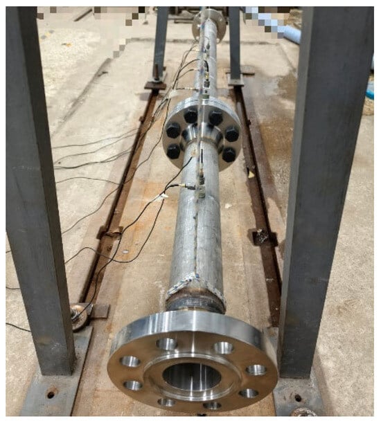 To verify the applicability of the method proposed in this paper on actual pipes, this section will further illustrate the application of the flange model and method described in this paper through complex pipes containing flat-weld flanges and weld-neck flanges. In the overall pipe model built in this experiment, weld-neck flanges are connected by bolts to simulate the pipe connection situation in actual engineering. The schematic of the pipe installation and the physical diagram of the experiment are shown in Figure 14 and Figure 15. In Figure 14, the A and B ends of the pipe are connected to the support by nylon ropes. At this time, the pipe is equivalent to free support, and its boundary constraint matrix B is shown in Equation (13). Points 1 and 2 represent the measurement points for the vibration acceleration of the pipe wall. The inner radius of the straight pipe is R = 0.0325 m, and the wall thickness is e = 0.005 m. The pipe material is structural steel, with Young’s modulus E = 1.90 × 1011 Pa, density ρl =7850 kg/m3, and Poisson’s ratio ν = 0.3. We adopt DN65 weld-neck flanges and flat-weld flanges.