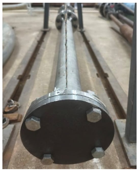 Consider the pipe filled with water. In the experiment, water is sealed in the pipe through blind plates. The blind plates at both ends of the pipe weighed 2.92 kg and 4.62 kg, respectively, as shown in Figure 18. The positions of the pipe vibration measurement points and the experimental process are the same as those in the air-filled pipe.