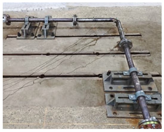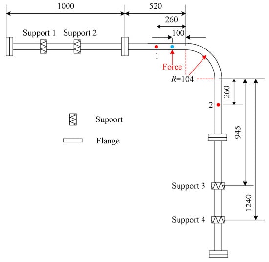 Validation of the applicability of the method proposed for complex pipelines and boundary conditions is conducted on the pipe shown in Figure 20. The pipe has an inner diameter of 52 mm, a wall thickness of 4 mm, and other sizes are shown in Figure 21. The pipe is filled with water. The material properties of the pipe are the same as those in Section 4.4. Both ends of the pipe are free, and the straight pipe sections at both ends of the elbow are connected to the base via clamps.