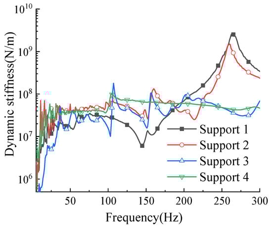 Before verification, it is necessary to measure the support stiffness in the experimental installation state. The vertical stiffness of each support is measured through experiments, as shown in Figure 22.