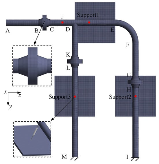 Common pipeline systems include pipeline components with regular geometric structures, such as straight pipes, elbow pipes, and branch pipes, as well as pipeline components with irregular geometric structures, such as flanges and flexible supports. Regular geometric structures pipeline components, such as straight pipes, elbow pipes, and branch pipes, can have their mathematical models established through theoretical derivation [8,9,10,11,12]. Tentarelli [8] expounded the dynamic equation of a single fluid-filled pipeline based on the transfer matrix method; Lesmez et al. [9] adopted the transfer matrix method and established the fluid–structure coupling model of the L-shaped liquid-filled pipe by equivalent the elbow pipe to multiple straight pipes; Cao et al. [10] established the mixed energy transfer matrix method (HETMM), effectively solving the problem of numerical instability existing in the vibration solution method based on TMM during high-frequency calculation, and analyzed the natural frequency of the dual-branch pipeline system; Deng et al. [11] considered the fluid friction and the flexibility correction of the elbow, calculated the natural frequency and frequency response of the Z-shaped hydraulic pipeline using TMM, and compared them with the experimental results.
