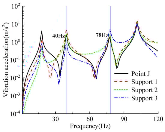 At point J, which is 0.2 m away from end C, an external harmonic excitation force of 10 N is applied. The acceleration responses of each measurement point in the pipeline are shown in Figure 26. Industrial current-carrying pipelines may be stimulated by water pumps during operation. Under normal circumstances, the rotational speed Rp of the water pump connected to the industrial flow-carrying pipeline is mostly within the range of 1500–3600 r/min, and the excitation base frequency corresponding to this rotational speed range is approximately 25–60 Hz. This paper assumes that the pipeline to be optimized is excited by a fundamental frequency of 40 Hz. In practical situations, in addition to the fundamental frequency vibration, the excitation source often generates certain excitation at integer multiples of its frequency. Therefore, the excitation effect of the excitation source at 80 Hz, which is twice the fundamental frequency, is considered. According to the frequency reserve requirements [21], the resonance domains of the two excitation frequencies can be calculated as 36–44 Hz and 72–88 Hz, respectively. It can be seen in Figure 26 that the second and third natural frequencies of the current-carrying pipeline both fall within the resonance range and need to be optimized. Therefore, in this paper, the optimization targets of the second and third natural frequencies are set at 48 Hz and 95 Hz, respectively.