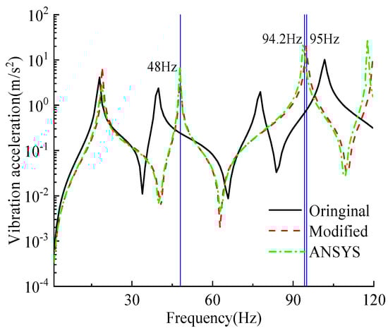 The MATLAB (R2019b Version) program is written based on the relationship between the independent variable and the objective function. Through the MOPSO algorithm, the optimal stiffness values of supports 1, 2, and 3 are calculated as 5.09 × 106 N/m, 1 × 104 N/m, and 7.99 × 106 N/m, respectively. The optimal solution is substituted into this method for calculation, and a finite element model is established for simulation. During the finite element calculation, we fix the four sides of the support base. The acceleration responses of point J before and after the optimized configuration are shown in Figure 27. The second and third natural frequencies of the pipeline as calculated by simulation are 47.9 Hz and 94.2 Hz, respectively, and the errors between the theoretical optimization objective and the simulation results are 0.2% and 0.4%, respectively.