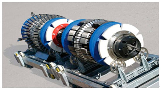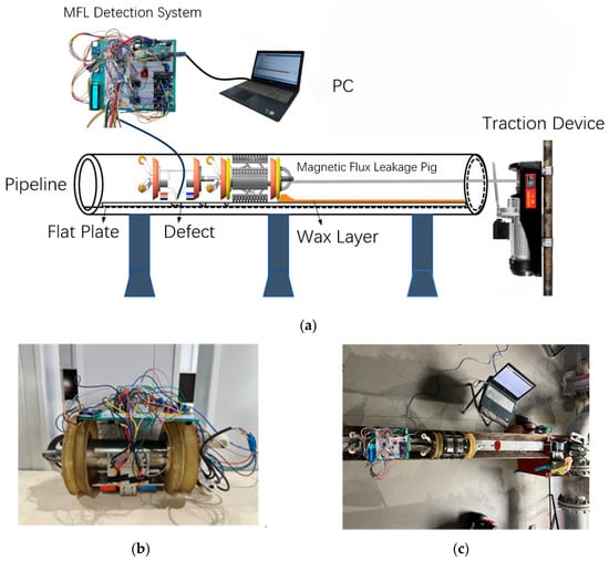 As MFL technology matured, diverse detection systems were developed for pipeline defect signal acquisition []. The Rosen Group (Germany) developed a high-resolution MFL detector with a sensor array, enabling precise identification of internal corrosion defects, as shown in Figure 1. Kim et al. designed a compact spider-type MFL detector for small-scale operations, employing an Arduino MEGA microcontroller and A1321 Hall sensors to collect magnetic field signals, with feasibility validated via simulations and experiments []. Xin et al. developed a high-precision, low-magnetic-force crack detection method using SMSE technology for micro-defects, creating a system with a PC, data acquisition card, and probe, capable of detecting 0.3 mm-wide cracks []. Guo et al. designed a triaxial high-definition MFL in-line detector using an ARM-STM32 chip, with reliability confirmed via pull-through experiments []. The Piao team at Tsinghua University developed an in-line inspection pig integrating a magnetization device, electrical sensors, a recording system, and an explosion-proof battery, enabling simultaneous measurement of 160-channel triaxial MFL and 80-channel PEC signals [].