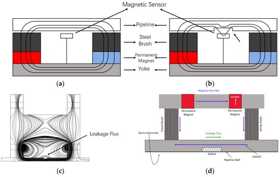 Schematic diagram of the MFL inspection principle: (a) pipeline without defects; (b) pipeline with defects; (c) MFL field schematic; (d) schematic diagram of the magnetic circuit of the MFL device.